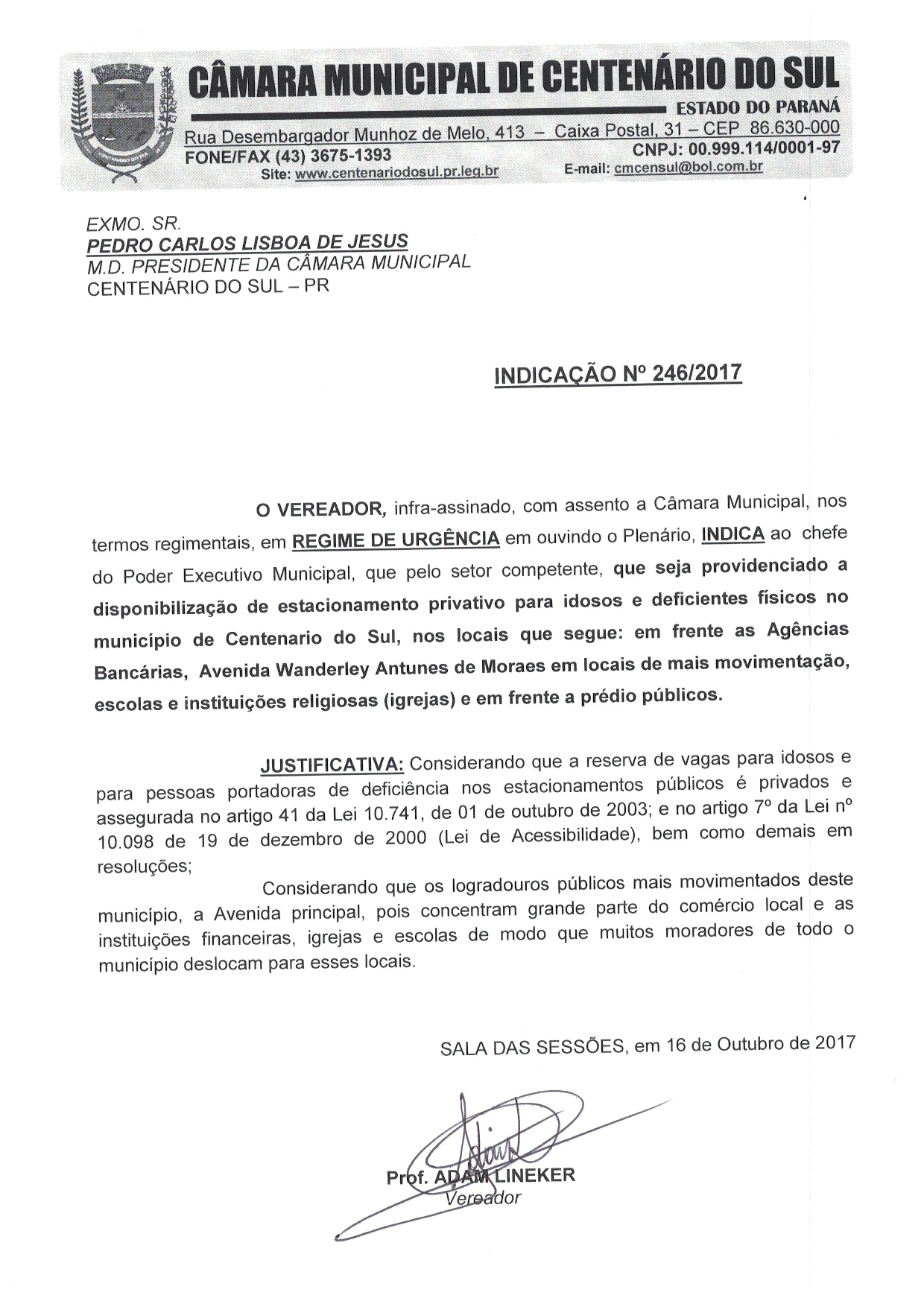 QUE SEJA PROVIDENCIADO A DISPONIBILIZAÇÃO DE ESTACIONAMENTO PRIVATIVO PARA IDOSOS E DEFICIENTES FÍSICOS NO MUNICÍPIO DE CENTENÁRIO DO SUL, NOS LOCAIS QUE SEGUE: EM FRENTE AS AGÊNCIAS BANCÁRIAS, AVENIDA WANDERLEY ANTUNES DE MORAES EM LOCAIS DE MAIS MOVIMENTAÇÃO, ESCOLAS E INSTITUIÇÕES RELIGIOSAS (IGREJAS) E EM FRENTE A PRÉDIO PÚBLICOS.