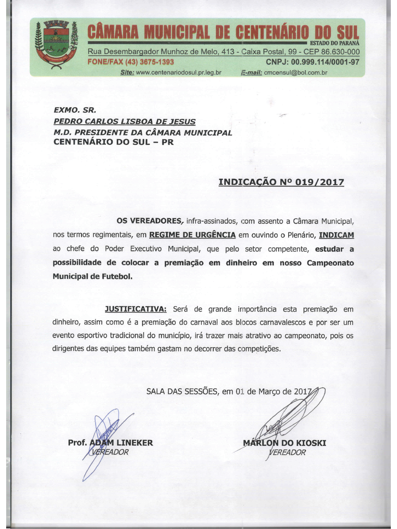ESTUDAR A POSSIBILIDADE DE COLOCAR A PREMIAÇÃO EM DINHEIRO EM NOSSO CAMPEONATO MUNICIPAL DE FUTEBOL.