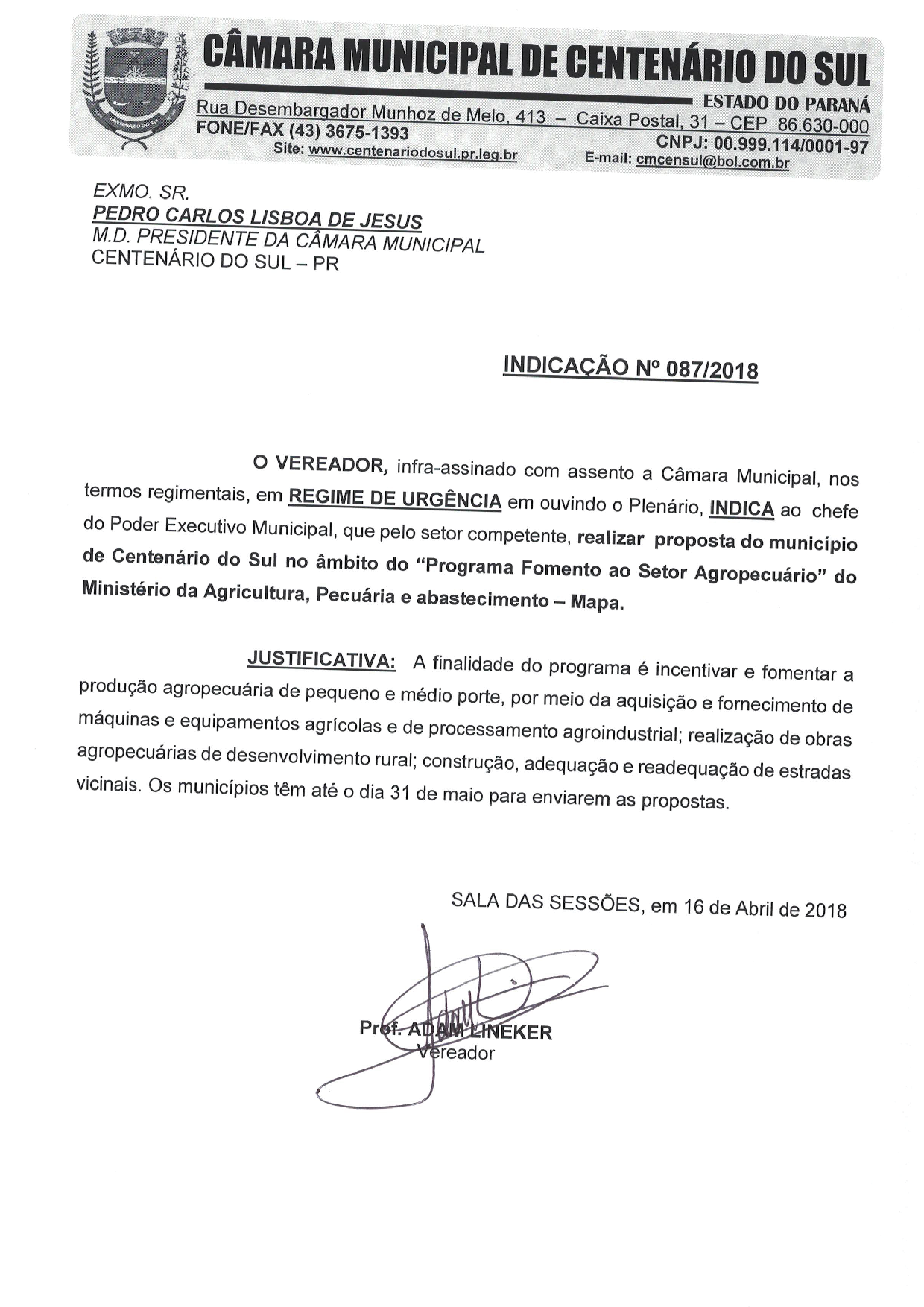 Ementa: REALIZAR PROPOSTA DO MUNICÍPIO DE CENTENÁRIO DO SUL NO ÂMBITO DO “PROGRAMA FOMENTO AO SETOR AGROPECUÁRIO” DO MINISTÉRIO DA AGRICULTURA, PECUÁRIA E ABASTECIMENTO – MAPA.