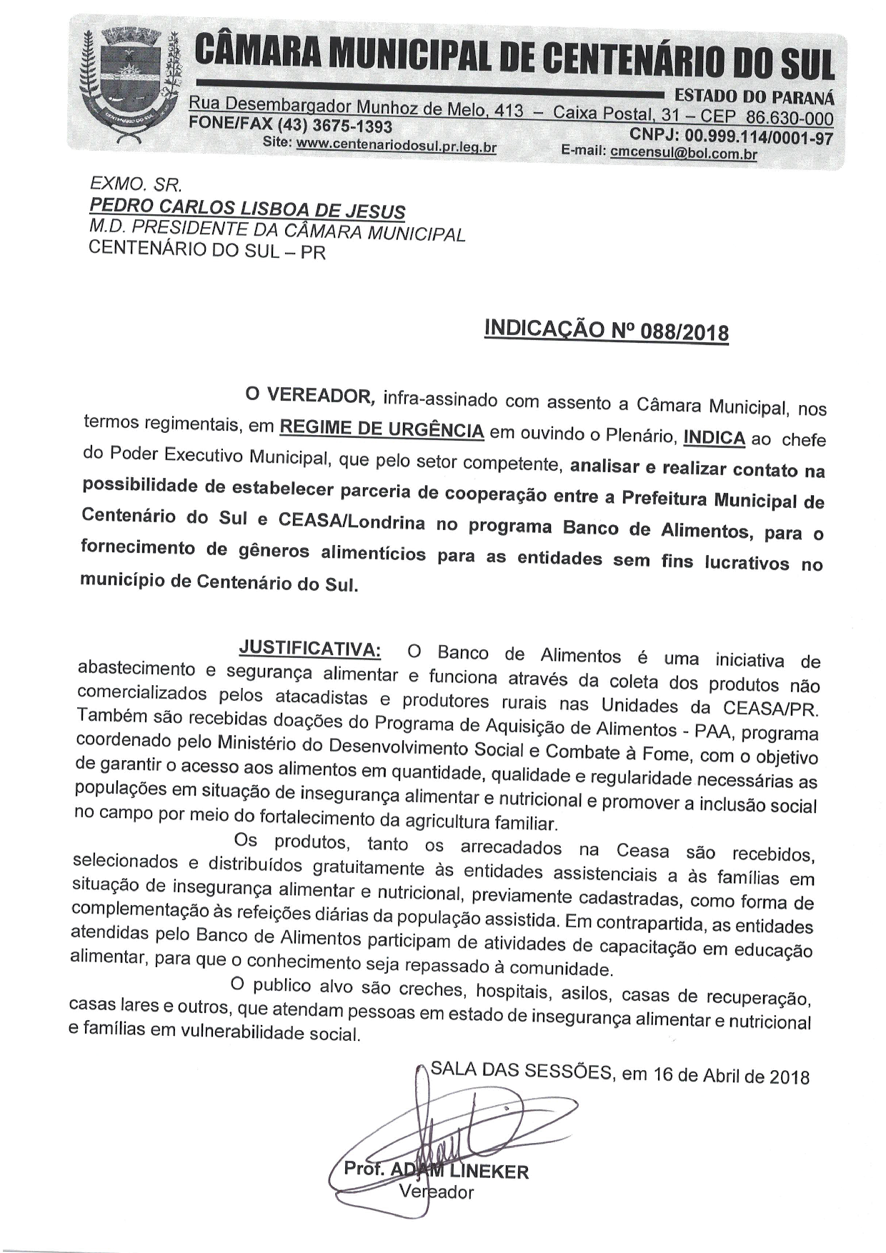 Ementa: ANALISAR E REALIZAR CONTATO NA POSSIBILIDADE DE ESTABELECER PARCERIA DE COOPERAÇÃO ENTRE A PREFEITURA MUNICIPAL DE CENTENÁRIO DO SUL E CEASA/LONDRINA NO PROGRAMA BANCO DE ALIMENTOS, PARA O FORNECIMENTO DE GÊNEROS ALIMENTÍCIOS PARA AS ENTIDADES SEM FINS LUCRATIVOS NO MUNICÍPIO DE CENTENÁRIO DO SUL.