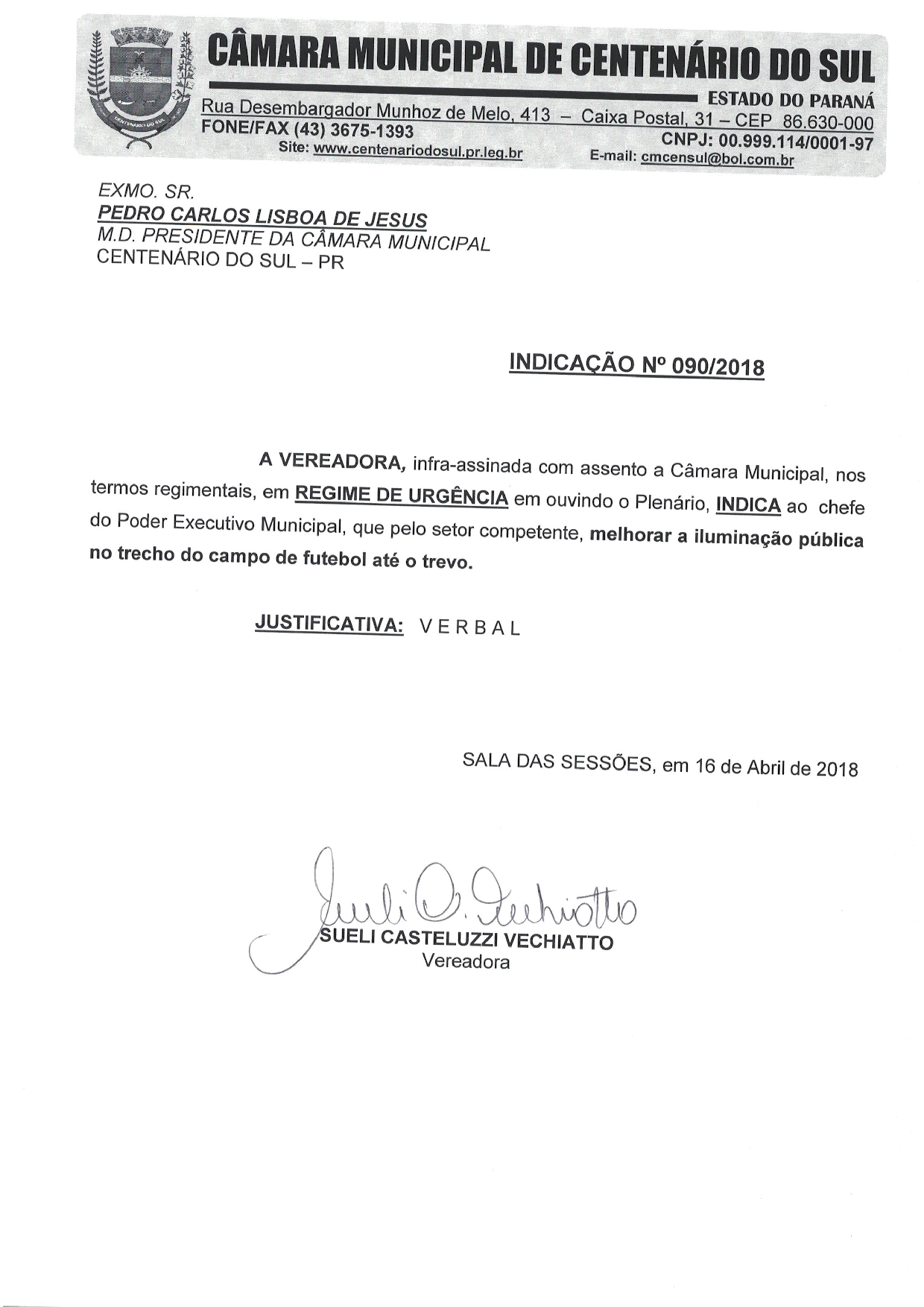 Ementa: MELHORAR A ILUMINAÇÃO PÚBLICA NO TRECHO DO CAMPO DE FUTEBOL ATÉ O TREVO.