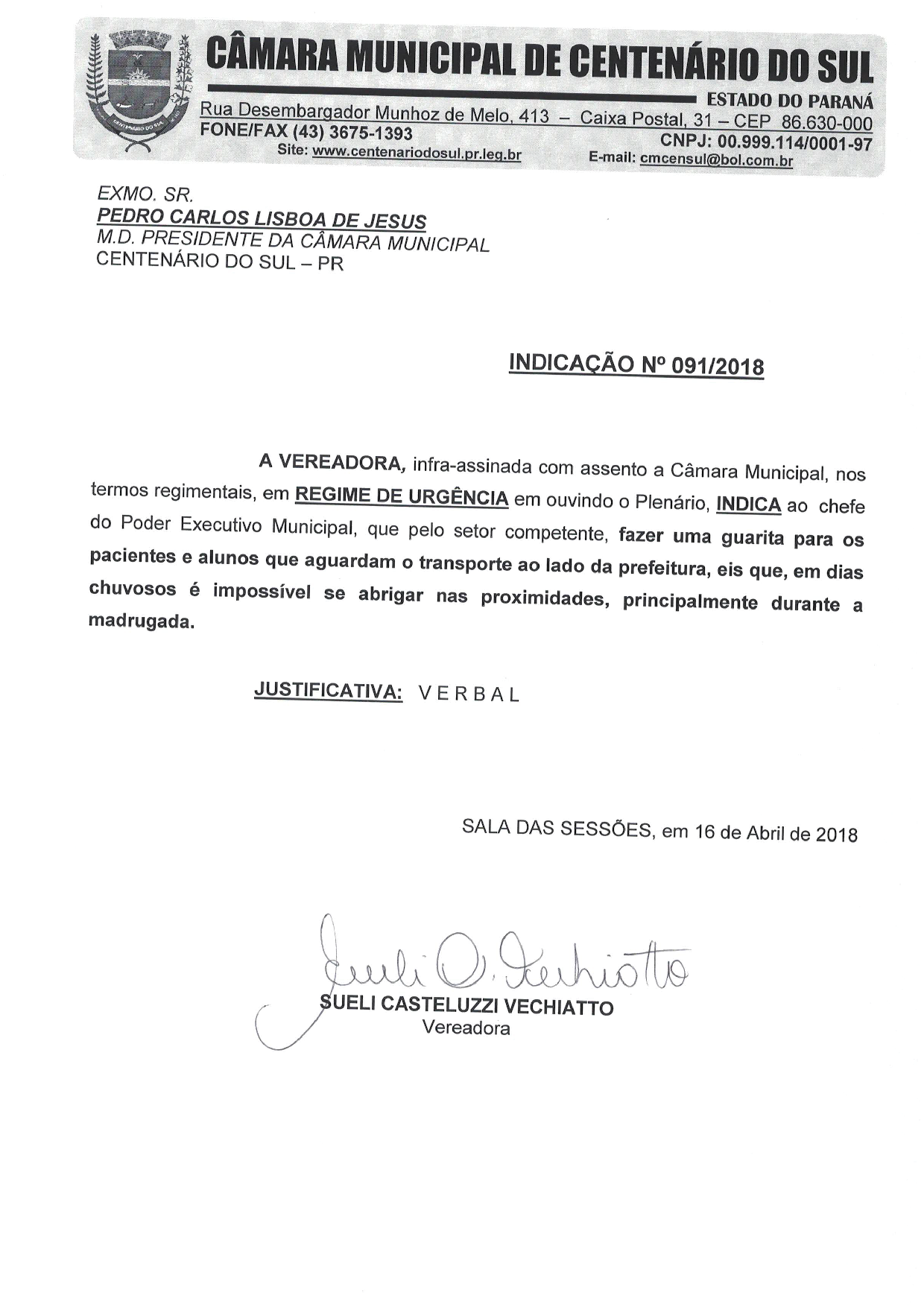Ementa: FAZER UMA GUARITA PARA OS PACIENTES E ALUNOS QUE AGUARDAM O TRANSPORTE AO LADO DA PREFEITURA, EIS QUE, EM DIAS CHUVOSOS É IMPOSSÍVEL SE ABRIGAR NAS PROXIMIDADES, PRINCIPALMENTE DURANTE A MADRUGADA.