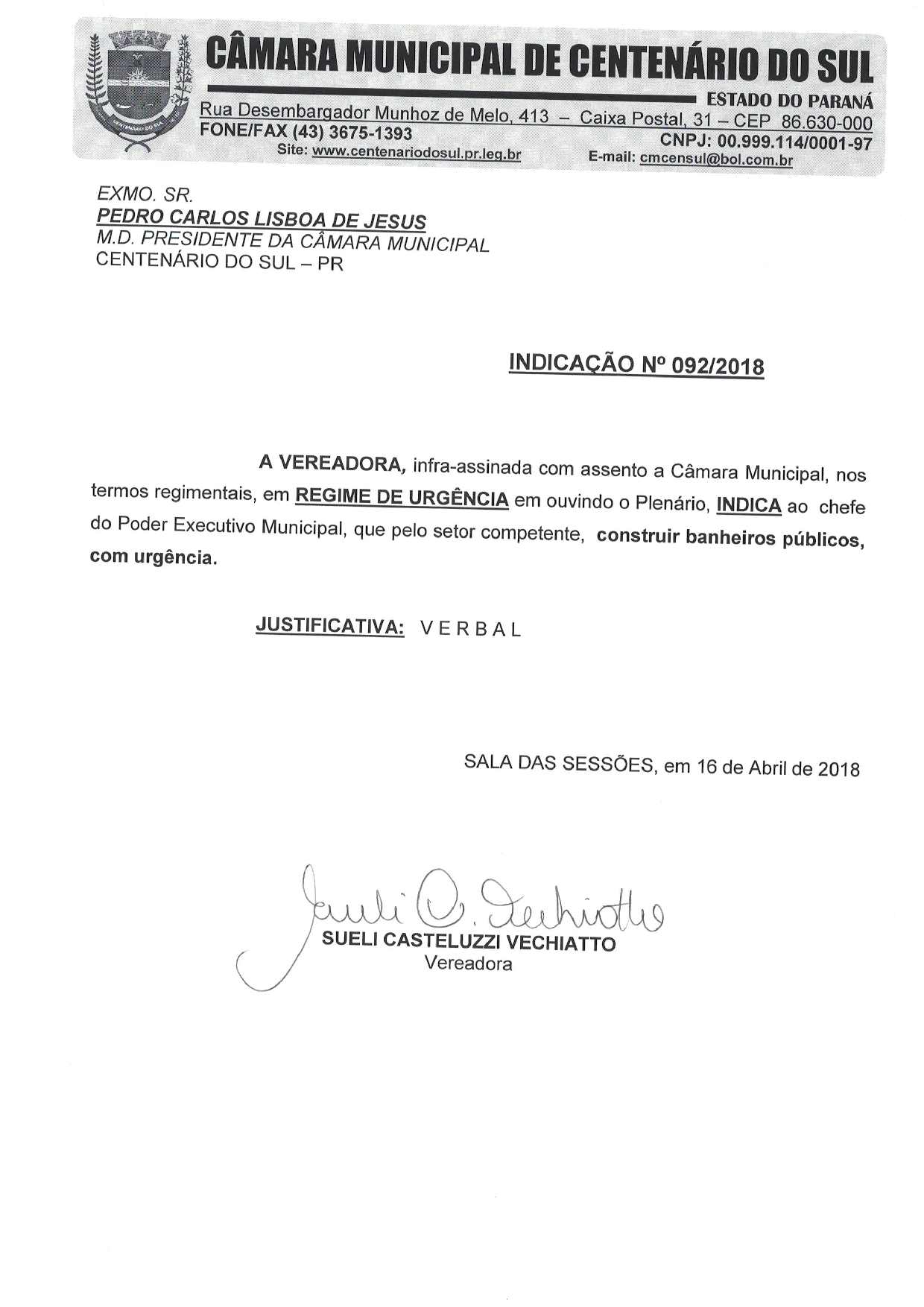 Ementa: CONSTRUIR BANHEIROS PÚBLICOS, COM URGÊNCIA.