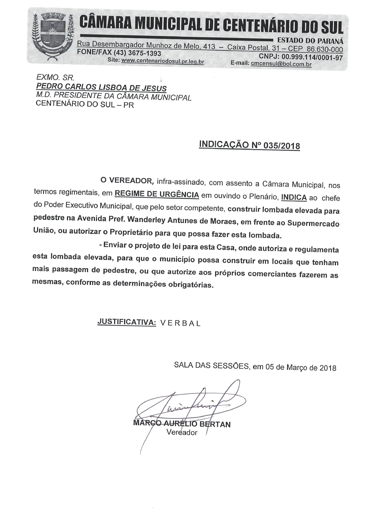 - ENVIAR O PROJETO DE LEI PARA ESTA CASA, ONDE AUTORIZA E REGULAMENTA ESTA LOMBADA ELEVADA, PARA QUE O MUNICÍPIO POSSA CONSTRUIR EM LOCAIS QUE TENHAM MAIS PASSAGEM DE PEDESTRE, OU QUE AUTORIZE AOS PRÓPRIOS COMERCIANTES FAZEREM AS MESMAS, CONFORME AS DETERMINAÇÕES OBRIGATÓRIAS. - - CONSTRUIR LOMBADA ELEVADA PARA PEDESTRE NA AVENIDA PREF. WANDERLEY ANTUNES DE MORAES, EM FRENTE AO SUPERMERCADO UNIÃO, OU AUTORIZAR O PROPRIETÁRIO PARA QUE POSSA FAZER ESTA LOMBADA.