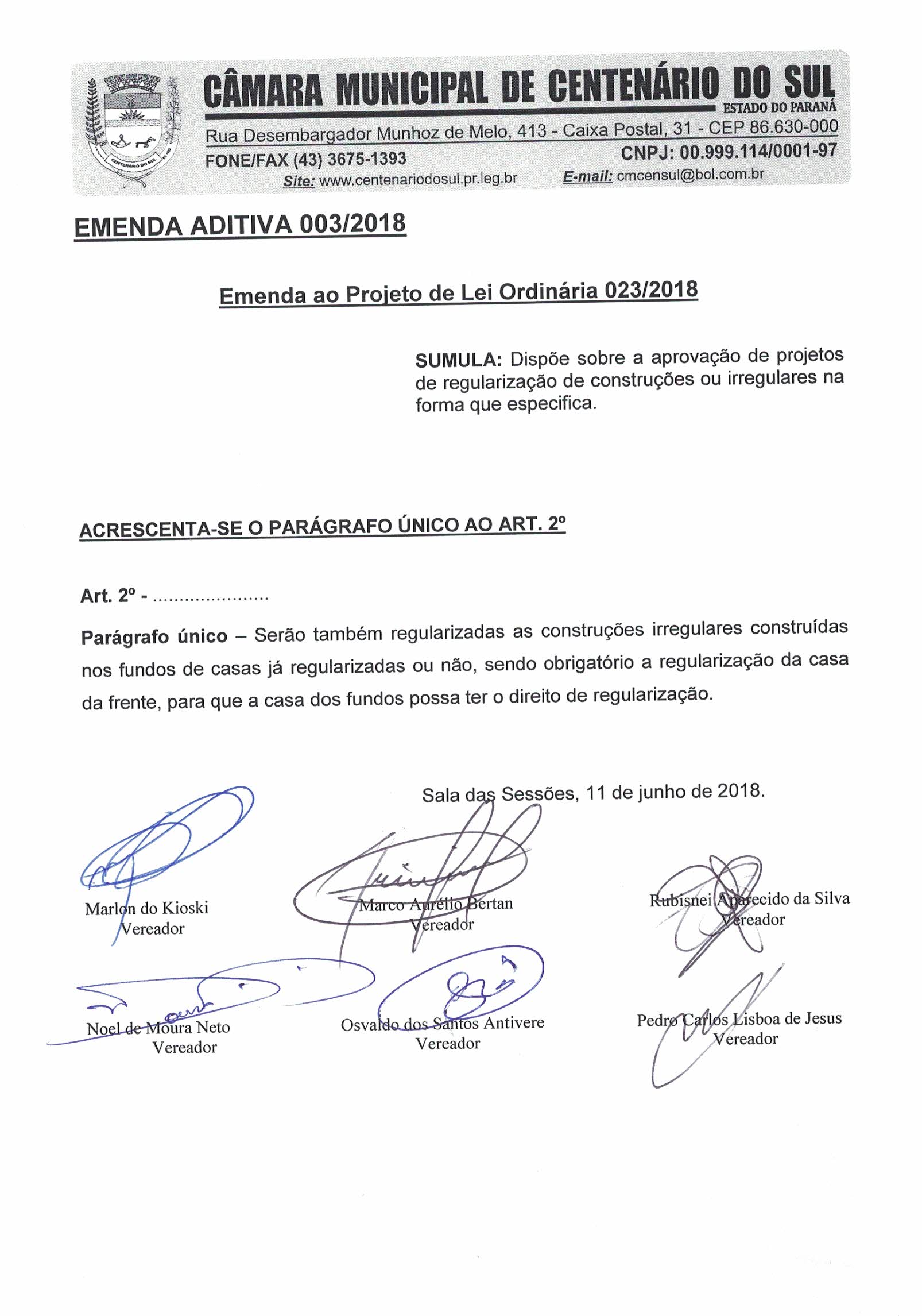 Aprovado Emenda aprovada ao Projeto de Lei 023/2018 |